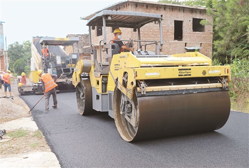 上图:7月17日,宁远县水市镇下立洞村,工人在高温下铺设沥青路面。