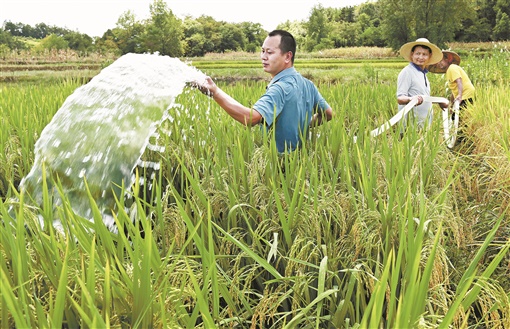 8月12日,洞口县高沙镇石磁村,村民在抽水灌田。6月下旬以来,该县持续出现高温天气,当地充分利用水库、机井、方塘等水源,抽水引水浇灌农田缓解旱情,全力保增收。滕治中 摄