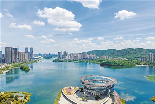 8月27日,长沙市梅溪湖碧波荡漾,与蔚蓝的天空交相辉映,构成了一幅水天一色的生态画卷。近年,长沙市坚定不移走生态优先、绿色发展之路,全力打好污染防治攻坚战,环境质量稳步提升。