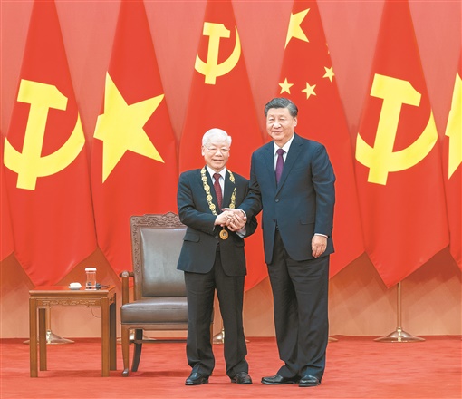 习近平发表讲话。习近平指出,阮富仲总书记是坚定的马克思主义者,是中国共产党的亲密同志和真诚朋友。在阮富仲总书记高度重视和亲自推动下,中越两党两国传统友谊得到巩固,政治互信不断增强,务实合作持续深化,交流互鉴日益密切。“友谊勋章”代表了中国共产党和中国人民对阮富仲总书记和越南人民的友好感情,象征着中越“同志加兄弟”的深厚情谊,蕴含着两党和两国人民共同追求美好未来的殷切希望。