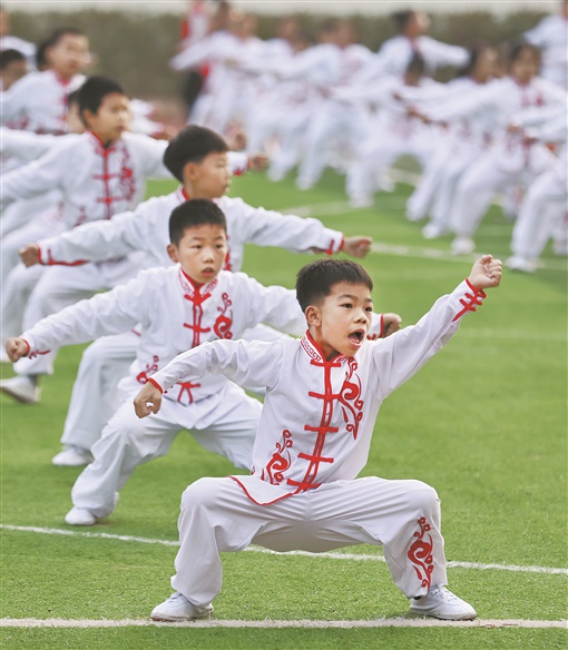 11月1日,长沙高新区博才云时代小学,学生在大课间进行武术操、刀术、棍术、太极拳等武术特色课展示。近年来,该校将武术特色课程引入校园,既丰富了校园文化,又提高了广大师生强身健体的意识。湖南日报全媒体记者 郭立亮 通讯员 何珍一 摄影报道