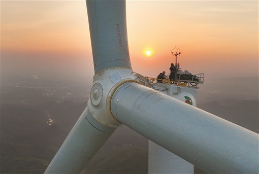 11月1日,祁东县灵官镇,国家电投五凌电力有限公司工作人员在风电机组上施工作业。近年来,该县大力发展新能源建设,走绿色低碳可持续发展之路。目前,该县已实现风电和光伏发电总装机容量260兆瓦投入运行,在为当地提供电力保障的同时,带动了群众增收。