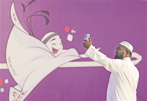2022年卡塔尔世界杯将于11月20日开幕,游人18日在世界杯吉祥物背景墙前自拍。新华社发