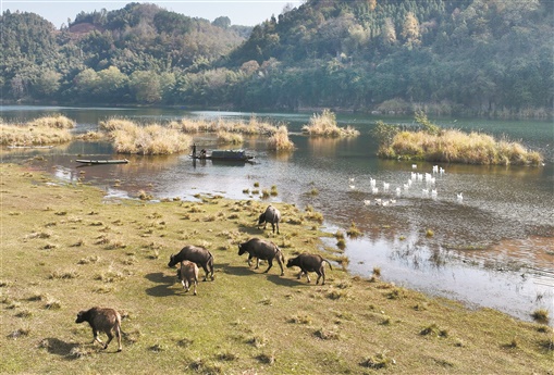 12月14日,洪江市清江湖国家湿地公园,水面清澈,白鹅、牛群、渔舟自然成趣。该湿地公园位于洪江市托口镇,总面积3032公顷,其中湿地面积2489.59公顷,湿地率82.11%。园内林丰草美,水碧天蓝,拥有维管植物815种、野生脊椎动物199种。 张锡文 摄