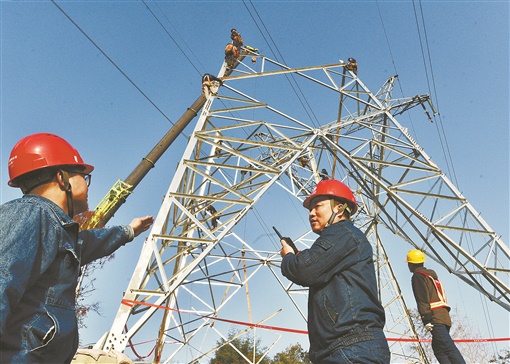 12月14日,嘉禾县行廊镇滑乐村嘉禾东-肖家110千伏线路工地,工人在组塔施工。仲冬时节,湖南电力工程咨询有限公司施工人员奋战工地,积极推进工程进度,确保春节前并网发电。黄春涛 陈小峰 摄影报道