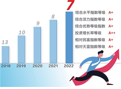 从2016年第19位、2017年第16位、2018年第13位,到2019年位列全国县域经济与县域综合发展第10位,首次跻身“全国10强”,再到2020年、2021年的第9位、第8位,浏阳实现了“高位再进位、高原攀高峰”。