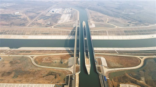 12月30日,中铁四局参建的引江济淮淠河总干渠渡槽通航(无人机照片)。淠河总干渠从引江济淮运河上凌空而过,呈现出河上有河的“水上立交”景象。