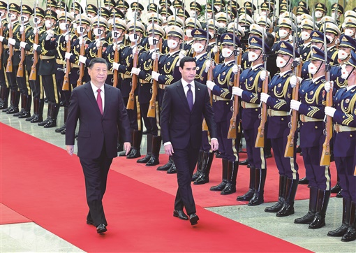 会谈前,习近平在人民大会堂北大厅为谢尔达尔·别尔德穆哈梅多夫举行欢迎仪式。