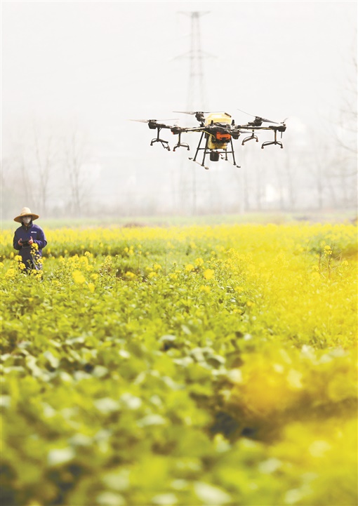 2月17日,资兴市蓼江镇,农技人员操作无人机对油菜田进行植保作业。时下正值油菜开花的关键期,该市农业部门加强农技力量,利用植保无人机帮农户管理油菜,助丰产丰收。