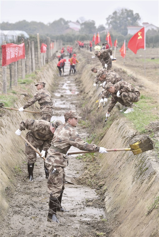 3月3日,浏阳市古港镇沔江村,190多名春季入伍新兵开展学雷锋志愿服务实践活动。新兵们拿着镰刀、铲子与志愿者一起清理沟渠,助力春耕。