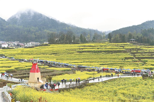 3月25日,花垣县麻栗场镇沙科村,游客在赏花休闲。当天,该村举办油菜花节,开展舞龙舞狮、打苗鼓、唱苗歌等文化活动,吸引众多游客赏花游玩。