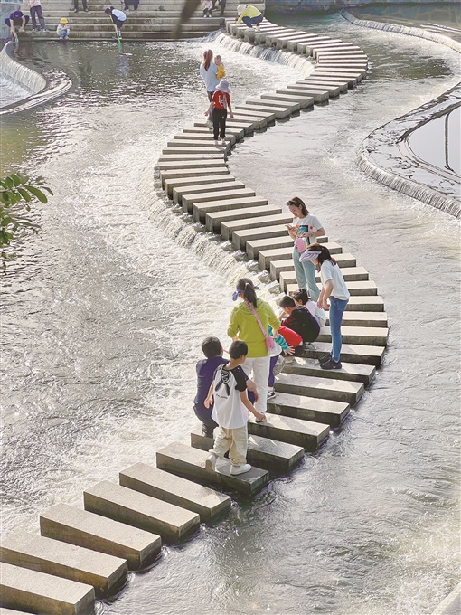 4月30日,长沙县金井镇,游客在修葺一新的金井河金龙坝上游玩。“五一”假期,城市周边的乡村旅游景点越来越受青睐。湖南日报全媒体记者 童迪 摄