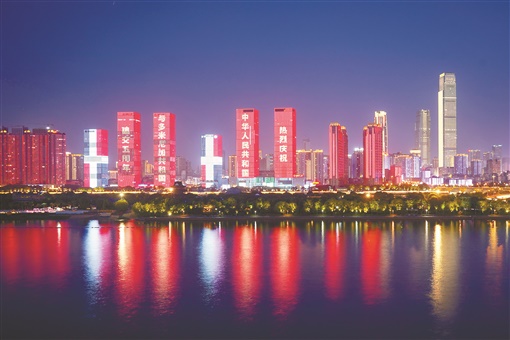 5月1日晚,长沙“一江两岸”如约上演灯光秀,地标建筑上“热烈庆祝中华人民共和国与多米尼加共和国建交五周年”标语与多米尼加共和国国旗的主题灯光交相辉映、璀璨夺目。