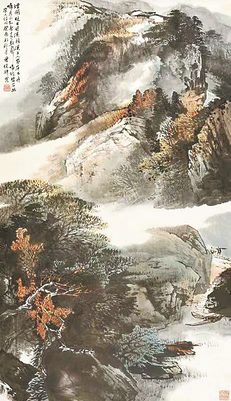 翠绿色系是对盎然春意的美好祝福,赭黄色系则是对金秋的生命礼赞。曾晓浒对秋景情有独钟。他画过很多秋景名作,如《斜阳明芳树 烟村归牧樵》《萧萧木叶秋正浓》《幻化云峰起遐思》《峨眉山景》《苍然暮韵忆旧游》《溪云烟树醉看秋》《烟光藏落景 山骨露清秋》《曳杖溪桥外 共看落霞光》《春山不媚是清秋》《巫峡清秋》《溪山秋深》《溪上人家岸下舟》《梦回驱健蹄 又踏蜀山秋》《江岸秋艳图》《龙泉秋光里》《明霞映秋树》《清秋走马出卧龙》《江秋霁图》等等。中国文化人对秋天特别敏感,诗词歌赋及绘画作品描写秋景的特别多。我曾经对中国古代诗词的季节题材作过粗略统计,发现描写秋天的篇什远多于其他季节,而在描写秋天的诗歌和文赋中,又以悲秋和伤秋的主题居多。显然,秋天的成熟、秋天的灿烂、秋天的热烈和秋天的萧瑟,能够激发文人墨客太多的生命感悟。但在曾晓浒笔下,秋景则有着完全不同于古代文人的情调。他会用大泼墨和大块面山石留白的黑白对比来表现秋景的明净,运用西画的色调概念,将赭黄色作为基调,与淡墨浑融,渲染草坡和山石,再用朱磦、朱砂点染秋树霜叶,并衬之以浓墨,使红色更为醒目。为了避免秋景的萧瑟,他还会用花青甚至带紫色的群青来大片渲染远峰青影和山谷岚气,暖色调的热烈和冷色调的清凉,恰到好处地表现出秋天的两面情调。