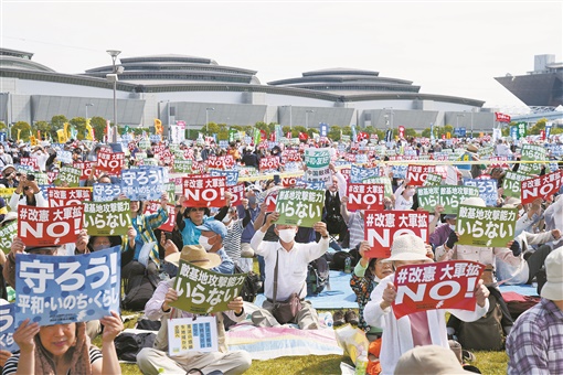 5月3日是日本宪法纪念日。当天,约2.5万名日本民众聚集在东京有明防灾公园的广场上,举行了守护宪法集会,他们打出守护宪法、反对强军扩武、不要反击能力、反对修改宪法等内容的标语和旗帜,呼吁守护宪法、守护和平。