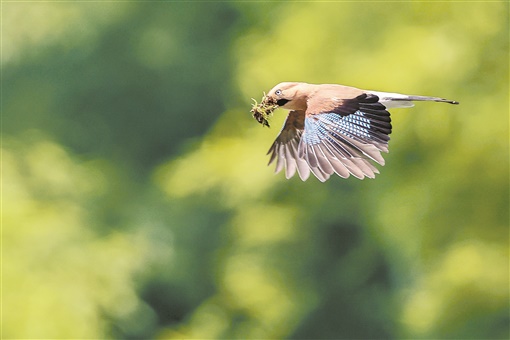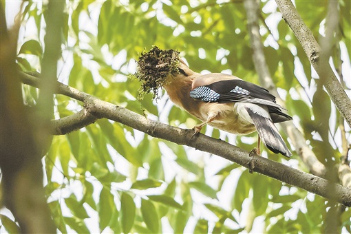 6月4日,长沙市望城区靖港镇,松鸦口中衔满了“建材”,准备搭建鸟巢。