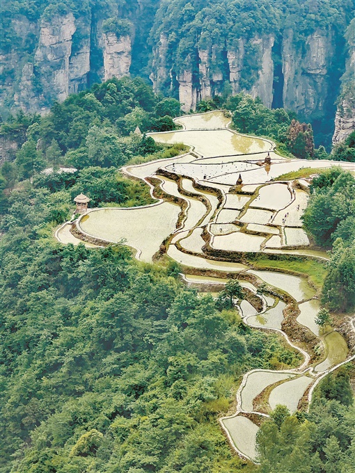 六月十二日,村民在张家界国家森林公园天子山空中田园插秧。空中田园是张家界近年来的网红打卡景点,因位于峰林之上,仿佛悬在空中而得名。邓道理 摄