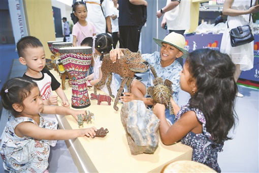 7月1日,第三届中非经贸博览会现场,中非小朋友一起开心玩耍。