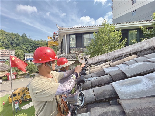 ▲7月3日,通道侗族自治县玉带路,工人在住宅楼安装屋檐彩色射灯。今年,该县加大夜间景观照明设施投入,让城市亮起来、美起来。陈俊宇 摄