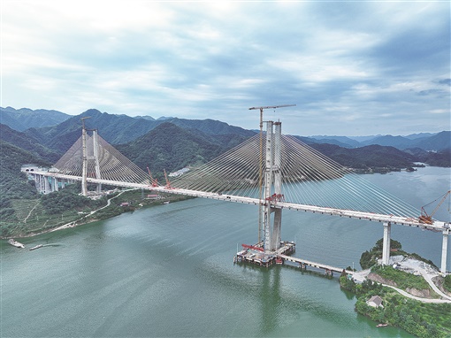 雪峰湖大桥位于益阳市安化县境内,横跨柘溪水库,大桥全长1187米,为主跨500米的双塔双索面半漂浮体系斜拉桥,两个主塔均采用H型设计,其中水中6号主塔高202.4米,岸上7号主塔高155.9米,是目前湖南省最大跨度钢混组合梁斜拉桥。