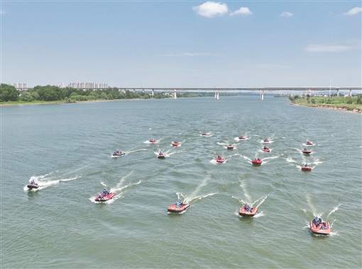 7月9日,湘江长沙市天心区兴马洲水域,蓝天救援队队员在进行冲锋艇编队演练。当天,来自湖南省蓝天救援队、湘潭蓝天救援队、韶山蓝天救援队等8支社会应急队伍、100余名技能骨干参加演练,全力提升队员的水上应急救援能力。