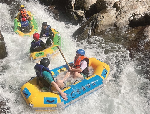 7月9日,游客在体验漂流的愉悦与刺激。连日来,通道侗族自治县龙底生态漂流吸引众多游客前来休闲度假,感受清凉。