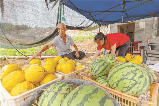 7月13日,龙山县民安街道红星村,瓜农在采摘瓜果。当地一座废弃的矿山经过生态修复、复垦复绿后,变成了瓜田。近年来,该县将生态修复与土地复垦相结合,让废弃矿山重新披上绿装,实现生态、经济、社会效益共赢。 彭舟 摄