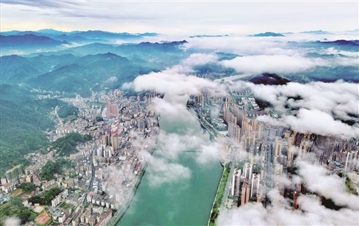 9月16日,安化县城,楼宇与悠悠资水在云海中若隐若现,景美如画。近年来,该县践行绿水青山就是金山银山的发展理念,坚持走茶旅文体康融合发展之路。