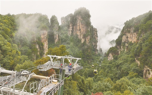 ▲ 10月1日,张家界武陵源景区杨家界索道检修工人在高空支架上检修设备。“双节”假期,该景区众多劳动者坚守在旅游服务一线,在岗位上度过节日。吴勇兵 摄