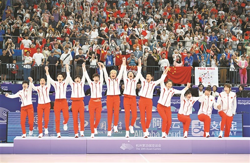 10月5日晚,中国女篮队员在领奖台上庆祝。当天,杭州亚运会女篮决赛在杭州奥体中心体育馆打响,中国女篮以74:72战胜日本女篮,赢得队史第7个亚运会冠军。 湖南日报全媒体记者 郭立亮 易昂 摄影报道