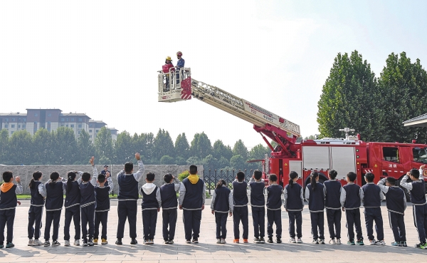 10月13日,是国际减灾日,各地学校开展防灾减灾知识普及和应急疏散演练等活动,以提高师生应急避险与安全自救能力。图为当日在河南省济源市延庆外国语学校,一名学生在消防员陪伴下乘云梯体验高空救援。新华社 发