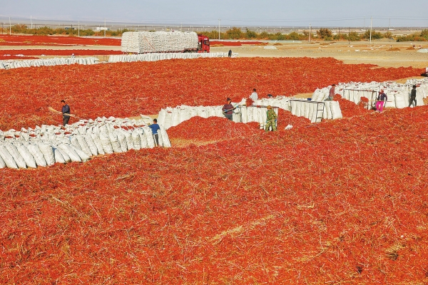 10月21日,新疆生产建设兵团第十二师二二一团万亩晾晒场,工人在装运辣椒。2016年,湖南投入援疆资金500万元,平整、碾压、硬化二二一团1.6万亩戈壁滩,为南北疆各地的辣椒、玉米规模种植户建起万亩晾晒场,带动200余名当地人员就业,年增收1000余万元。湖南日报全媒体记者 王立三 通讯员 周云峰 摄影报道