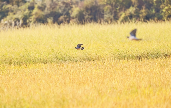 10月21日,长沙市望城区丁字湾街道,飞鸟在金黄的稻田里追逐嬉戏,一片秋色宜人的景象。