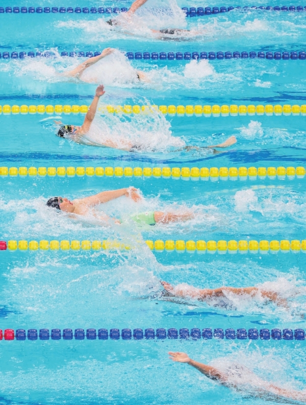 10月24日晚,杭州奥体中心游泳馆,游泳男子100米仰泳S14比赛现场,参赛选手们奋“泳”争先。 |