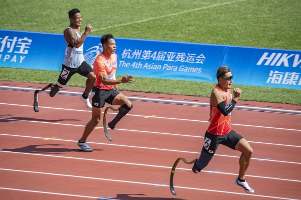 10月23日,杭州黄龙体育中心体育场,3名“刀锋战士”在田径男子200米T64比赛中展开激烈竞逐。 |