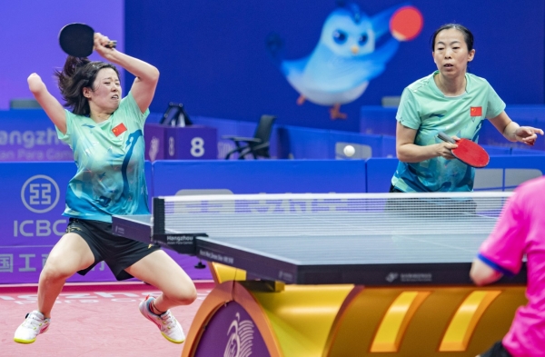 10月27日,杭州拱墅运河体育公园体育馆,乒乓球女子双打WD20决赛中,中国组合赵小静(左)、熊桂艳获得金牌。 |