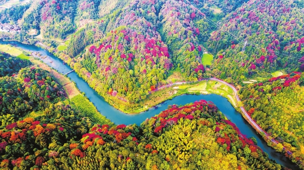 11月3日,通道侗族自治县双江镇烂阳村,色彩斑斓的山峦与蜿蜒的河流交相辉映,勾勒出一幅美丽的深秋画卷。尹序平 摄