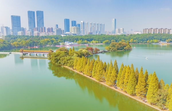 11月14日,被称作长沙城“绿肺”的湖南烈士公园年嘉湖畔色彩斑斓。初冬时节,一株株银杏、水杉、乌桕等古树名木姹紫嫣红,与园林碧水、城市楼宇等交相辉映,渲染一幅迷人画卷。