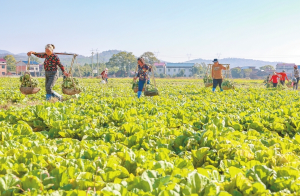 11月20日,永州市冷水滩区高溪市镇扶桥坝村,村民在搬运芥菜。近年来,该区大力推广“稻+菜”接茬轮作种植模式,利用闲置土地发展秋冬蔬菜种植,提高土地综合利用率,使“冬闲田”变“增收田”,带动农民持续增收。雷中祥 蒋凌志 摄影报道