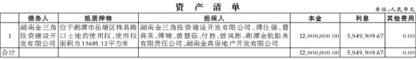 我司现有湖南金三角投资建设开发有限公司拟进行处置。上述债权资产抵押物主要位于湘潭市,抵押物主要为土地使用权,债权总额合计17,949,909.67 元,具体信息详见标的资产清单。
