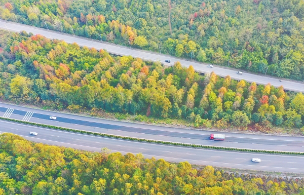 11月23日,嘉禾县晋屏镇,车辆行驶在厦蓉高速上。初冬时节,嘉禾县境内许广、厦蓉高速公路沿线层林尽染,茂密的梧桐、水杉、枫树等绚丽多彩,构成一幅五彩斑斓的生态画卷。