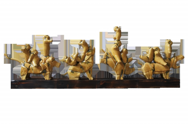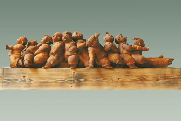 艺术从人民中来,也必然要回到人民中去。钱正财的创作始终秉承“以人民为中心”创作理念,他与泥土心意相通,能精准把握泥性,他将自己质朴的本色与泥土的朴素、灵性融为一体,用流畅的线条、别致的造型、生动丰富的艺术形态,来展示人性的美好,来体现对人的终极关怀。《再加把劲儿》气氛热烈,很有现场感,憨态可掬的造型将孩童的可爱和不服输精神渲染得淋漓尽致。《饼干人》系列用简单的造型和符号语言,聚焦当代人的生存困境。《姿态》系列思想内涵深刻,展现了积极向上的生活态度,入围了2023年中国民间文艺“山花奖”终评。他还有大量作品,通过抽象的造型与色彩背景的搭配来演绎人与自然的关系,体现了一个艺术家应有的悲悯情怀。