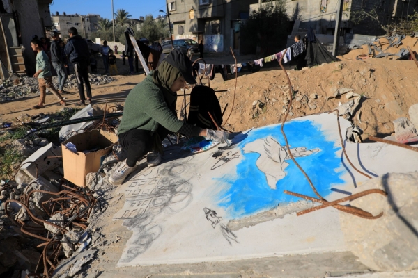 图为1月5日,在加沙地带南部城市拉法,巴勒斯坦画家阿迈勒·阿布·萨巴赫在废墟上绘画。