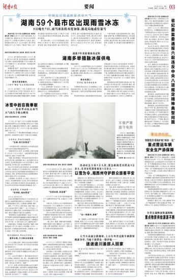 作为受灾最严重的地区之一,古丈县岩头镇山枣村旧村部钢架棚发生垮塌,由于事前村组干部现场察看,对住户和相关人员进行提醒和转移,未造成人员伤亡;龙山县大安乡万宝村山体滑坡造成交通阻塞,当地干群齐心协力铲冰除雪通路保畅;凤凰县千名志愿者用贴心的志愿服务温暖寒冬,为广大游客群众安全出行保驾护航。