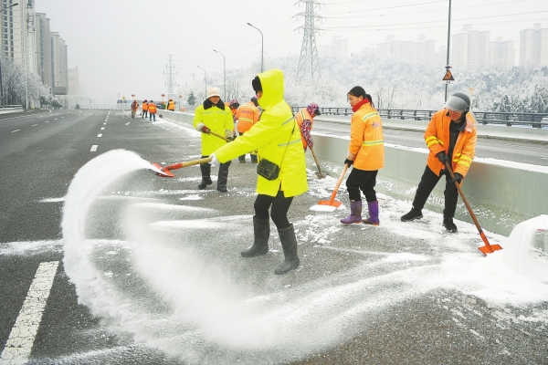 2月8日清晨,长沙市开福区兴联路跨京广铁路桥,开福区市容环境卫生维护中心工作人员对积雪结冰桥面进行清理。连日来,该中心积极应对低温雨雪天气,重点对桥梁、隧道等路段进行清理,保障行人、车辆通行安全。