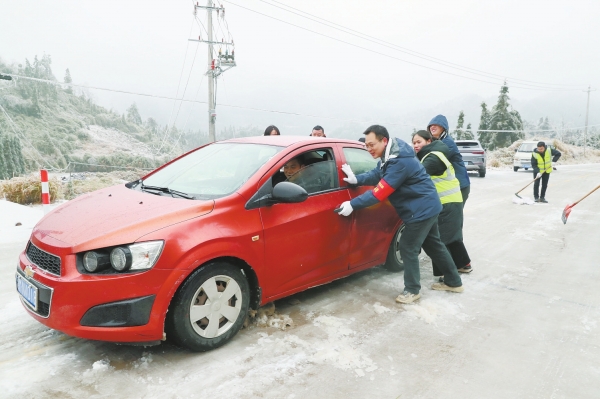 2月8日,新田县金陵镇国道G234卡子坳隧道路段,党员、志愿者在帮受困车辆脱困。连日来,为应对雨雪冰冻天气,该镇组织党员、志愿者对辖区路段进行清除冰雪作业,确保群众安全回乡欢度春节。