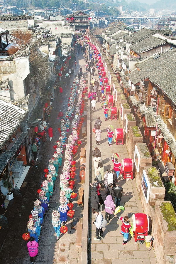 2月10日,演员在进行巡游表演。新晋为国家5A级旅游景区的凤凰古城旅游区在春节假期举行民俗文化巡游活动,为游人和市民献上一道丰盛的春节文化大餐。