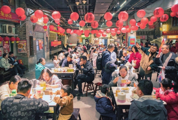 2月12日,市民、游客在长沙文和友品尝美食。春节假期,长沙文和友、费大厨、茶颜悦色、炊烟小炒黄牛肉等店铺前就餐等位者大排长龙,多家门店客流量创下新高,呈现一派火热消费景象。