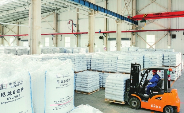 2月13日,湖南石化新区己内酰胺部聚酰胺装置成品仓库,当班员工在转运新下线的尼龙6产品。春节长假,湖南石化深入开展“百日安全无事故”专项行动,每天有超过5000名干部员工坚守岗位履职尽责,确保安全生产平稳运行。彭展 摄(湖南图片库)