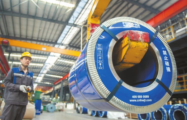 2月18日,娄底市娄星产业开发区湖南宏旺新材料科技有限公司,工作人员在搬运不锈钢卷材。春节长假后第一天,该开发区各大企业开足马力抓生产赶订单。
